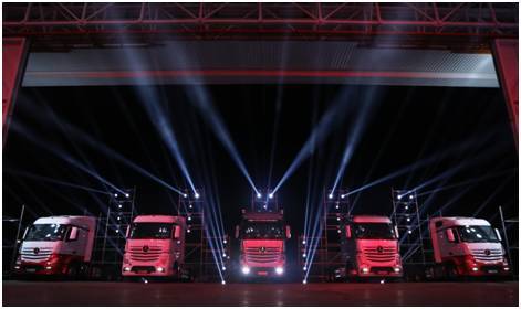 全球卡车行业、有着121年品牌历史的梅赛德斯-奔驰卡车在广东珠海举行庆典,发布新Actros公路牵引车及Arocs全能底盘。