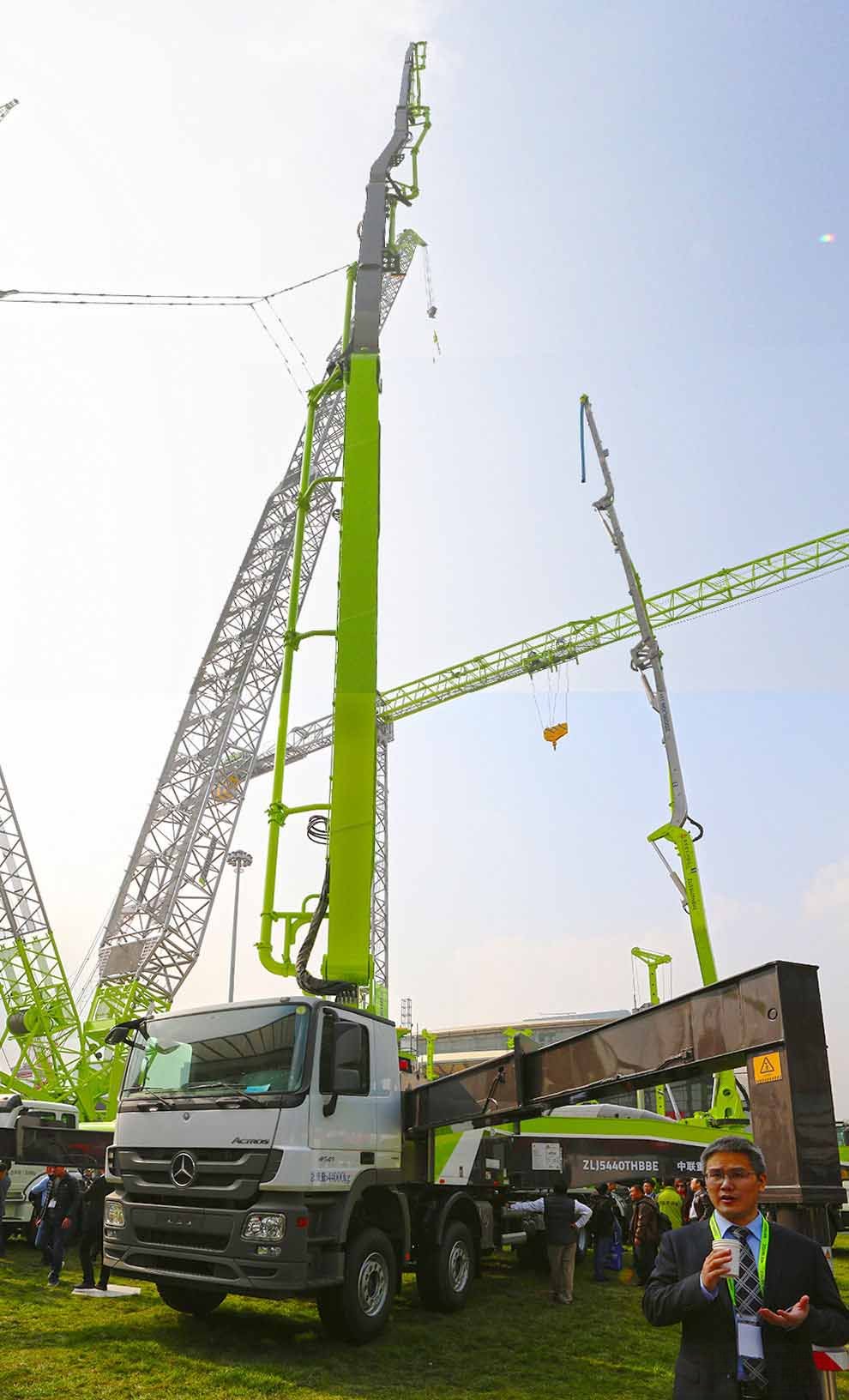 在中联重科展区中央,一辆极光绿涂装的智能四桥56米奔驰底盘泵车在众多车型中脱颖而出,成为众多专业观众关注的目标。这款车更高布料高度达56米,更大理论输送量为180m³/h,是2016年底面市的中联重科56米奔驰底盘高精高效泵车(ZLJ5440THBB 56X-6RZ)全新升级版本。这款业界颇有影响力的产品坐拥62项专利,是中联重科“4.0”工程的重大成果之一,在行业首创高精高效、高压泵送技术,曾在雄安新区市民服务中心、京雄铁路等重点项目建设中大显身手,并名列2017年湖南首届创新奖产品首位。