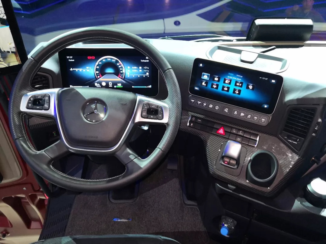 如今,万物互联已成大趋势,这不只是互联网行业的狂欢,更是各行各业数字化转型的方向。全新多媒体驾驶室通过高清显示屏取代了传统仪表盘,可以显示车辆行驶速度、发动机转速、油量等数据。另一块屏幕则为交互触摸屏,驾驶员可通过该屏幕便捷操控车辆的大部分功能,并能轻松连接到Apple CarPlay™或Android Auto。配合可选配的摄像头后视镜MirrorCam和两块智能交互触控屏,奔驰全新Actros优化了人、车、路的互联,极强的人车交互性为驾驶员提供便利。